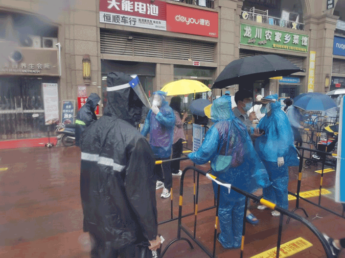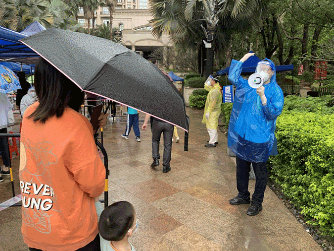 驟雨初歇,葉愛平同志一邊察看現場采樣情況,一邊簡要聽取了該集團現場負責同志的匯報。據了解,龍光社區與深圳接壤,面積大、入住人口多,每次核酸采樣工作量相比其他點要更大一些。環境水務集團每次抽調80人分早、晚兩班在該社區南、北兩個采樣點支援,從排隊引導、掃碼識別、信息錄入、愛心服務等,全體參與同志分工明確、相互配合,確保現場采樣井然有序進行。