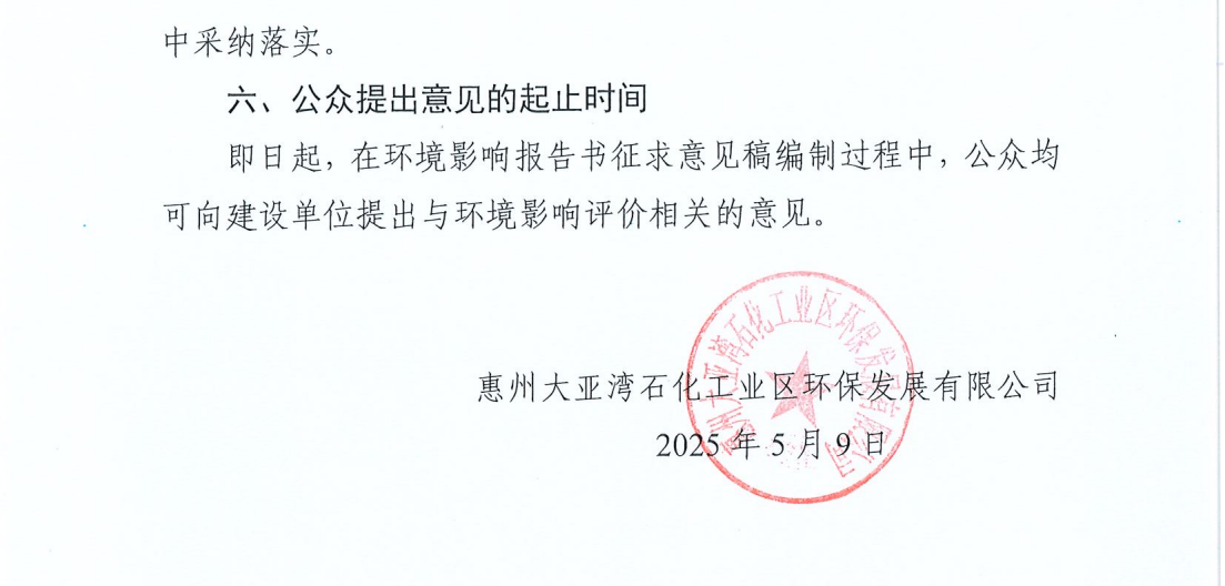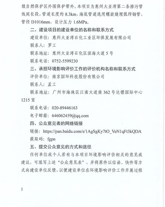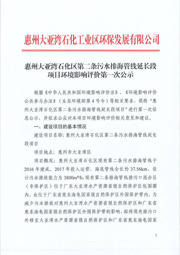 惠州大亞灣石化區(qū)第二條污水排海管線延長(zhǎng)段項(xiàng)目環(huán)境影響評(píng)價(jià)第一次公示